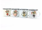 Emaille-Tasse mit Aufdruck für Kinder. Der Becher fasst 0,35l Inhalt. Die Tasse hat einen Durchmesser von 8cm.