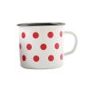 Emaille-Tasse in weißer Farbe mit roten Punkten. Der Becher fasst 0,4l. Die Tasse hat einen Durchmesser von 8 cm.