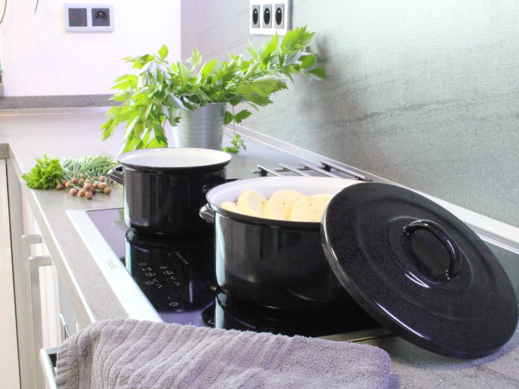 Emaille-Topf aus der Standart-Serie ist praktisch und langlebig und wird Ihnen wirklich lange Freude bereiten. Topf besteht aus Edelstahl, der mit langlebiger Emaille beschichtet ist. Die Innenseite des Topfes ist hellgraublau. Der Topf kann auf allen Herdarten verwendet werden, auch im Backofen. Es ist möglich, einen Topf mit einem Griff