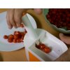 Svorkou upevněte strojek k desce pracovního stolu. Vložte pryžový stěrač a odpadní misku pro pecky . Ovoce vkládejte do řady, aby na sobě neleželo. Stlačením odpeckovací tyče vytlačíte pecku do odpadní nádoby. Při zpětném pohybu pístu ovoce zbavené pecky vypadne do připravené nádoby a místo něj se pod odpeckovací tyč posune další ovoce s peckou. Velmi usnadní a urychlí práci.