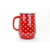 Smaltovaný džbán červené barvy s bílými puntíky.