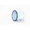 Smaltovaný hrneček bílé barvy s modrým okrajem.